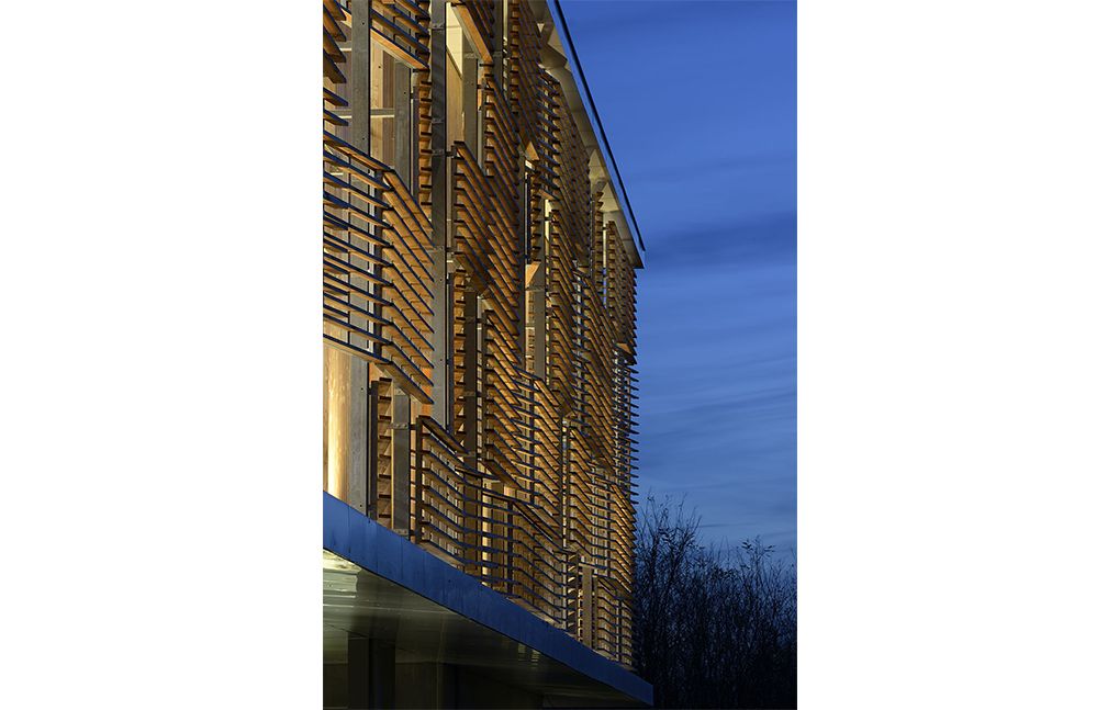 La restructuration de l’existant comprend une restructuration intérieure des bureaux, ainsi qu’un habillage thermique des façades, une seconde peau, constituée d’une treille bois, similaire aux façades de la partie extension permet d’affirmer une identité cohérente existant-extension.